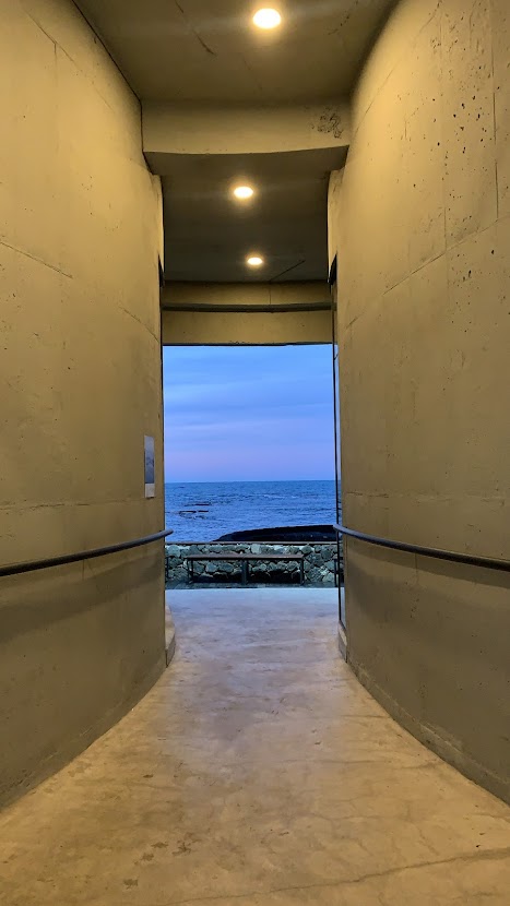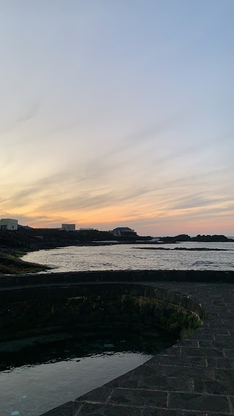 건물 앞에 있는 청굴물에서 바다를 더 보다가 들어갔어요.