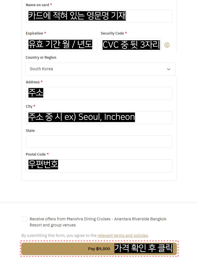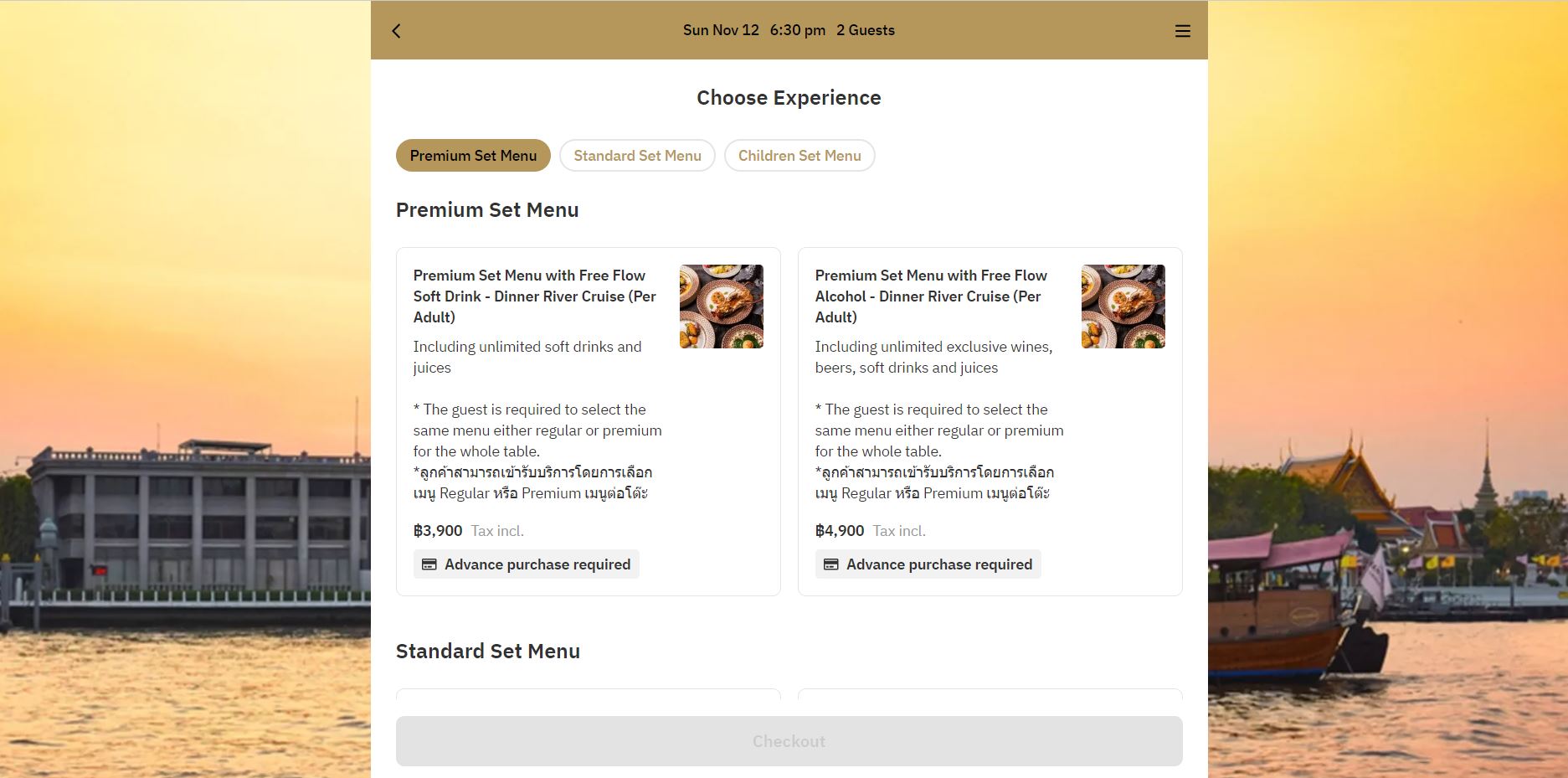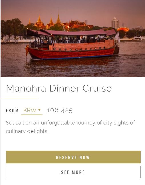 | 아난타라 공식 홈페이지 | www.anantara.com/en/riverside-bangkok/offers | 18:30 크루즈 스탠다드 (음료 무제한) 2,900바트 한화 약 107,000원 스탠다드 (술 무제한) 3,900바트 한화 약 145,000원 프리미엄(음료 무제한) 3,900바트 한화 107,000원 스탠다드(술 무제한) 4,900바트 한화 181,000원 |