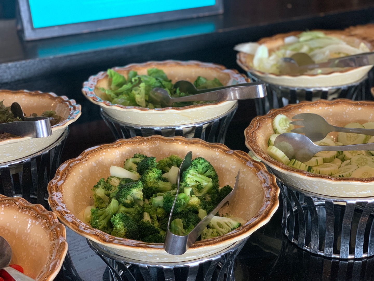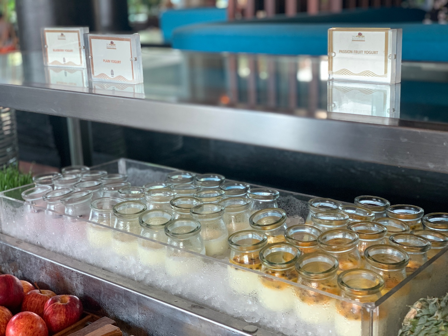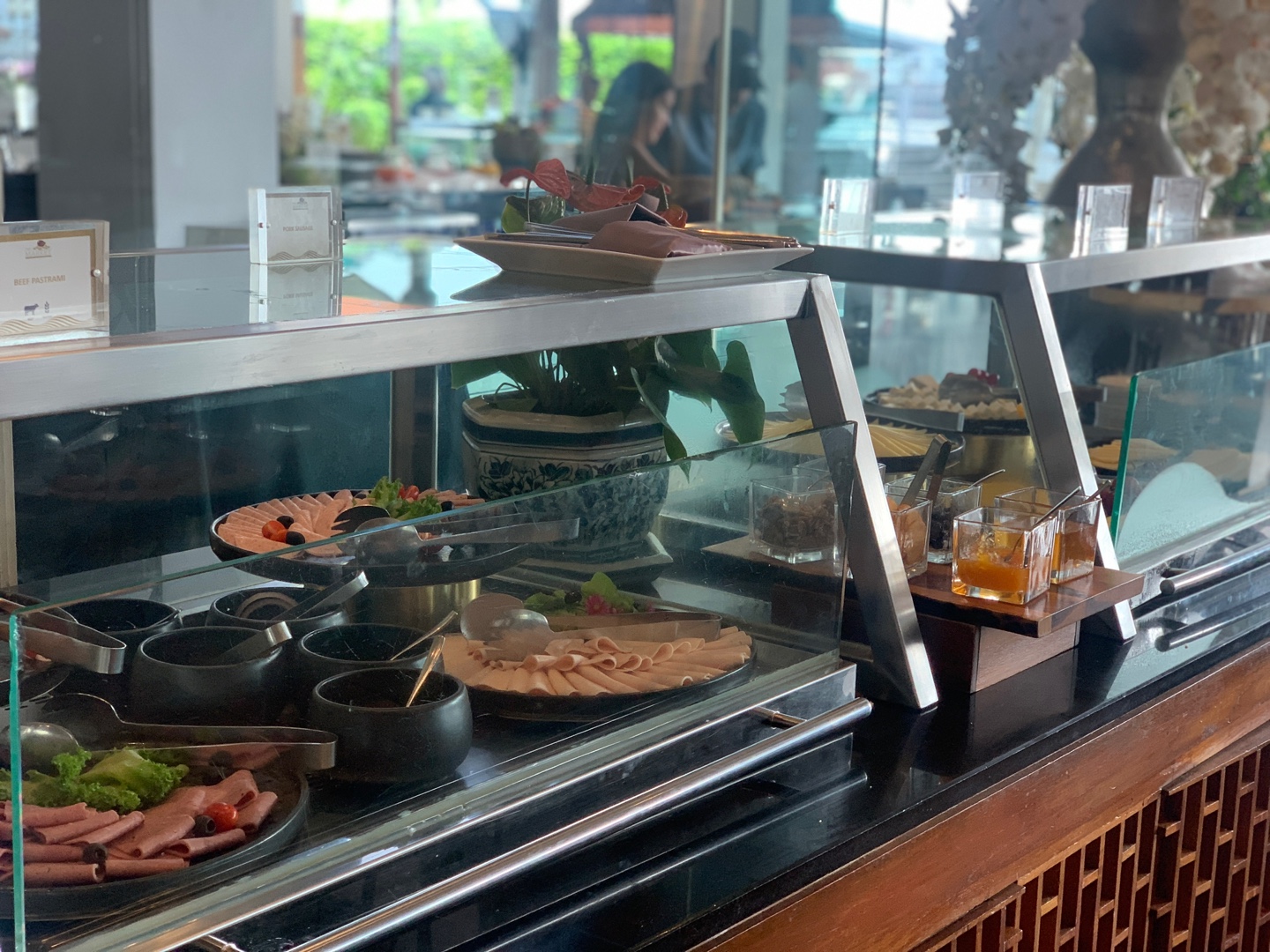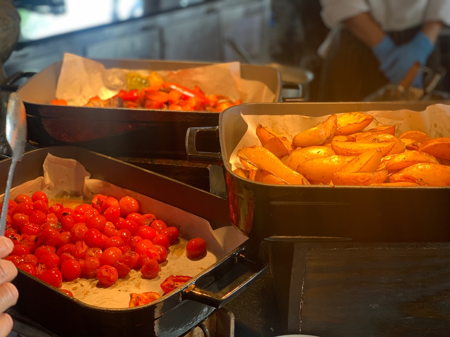 차가운 음식(샐러드, 과일 요거트)와 빵류는 실내에 있었고