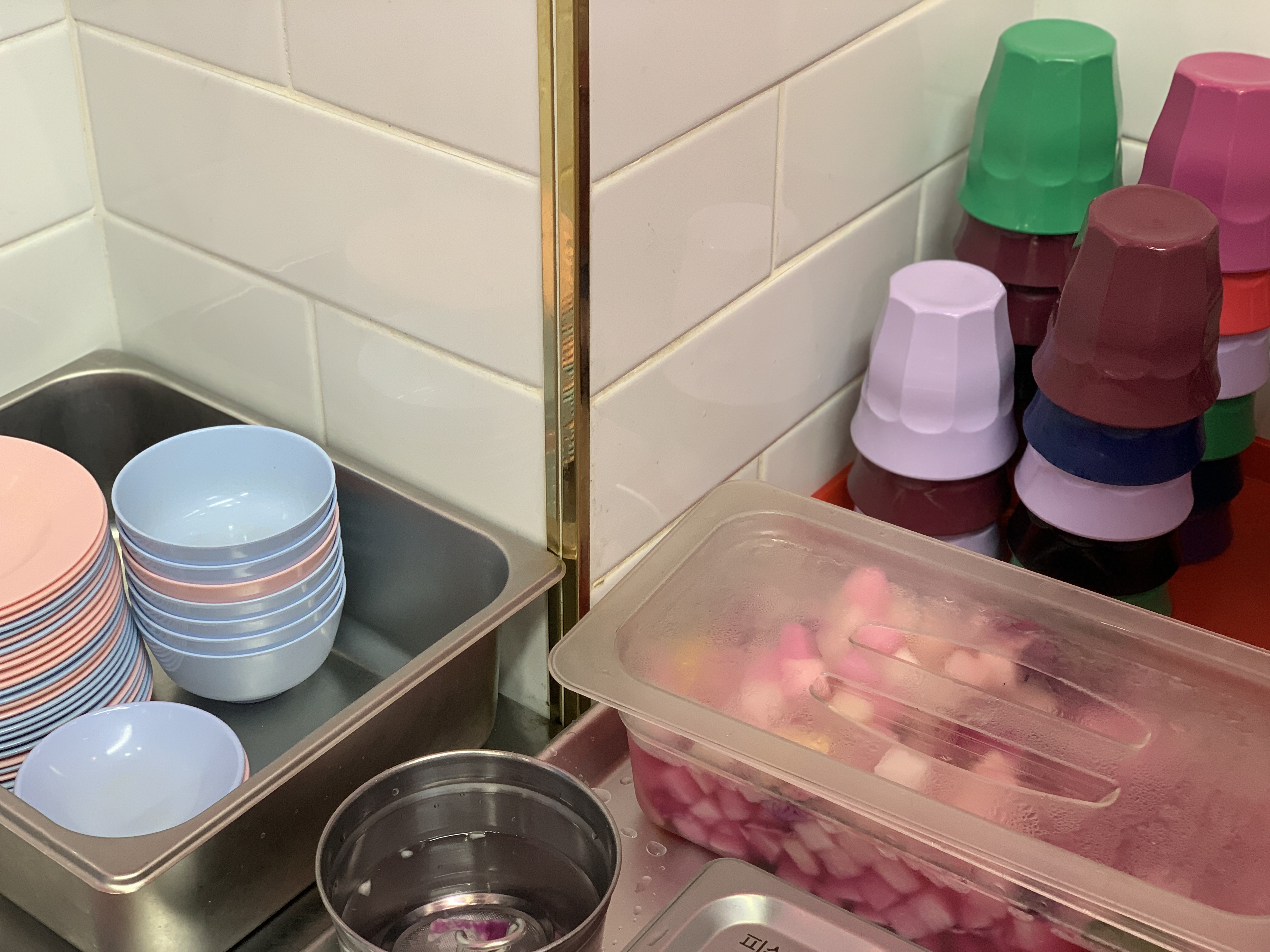 이런 벽 색깔과 컵, 그릇