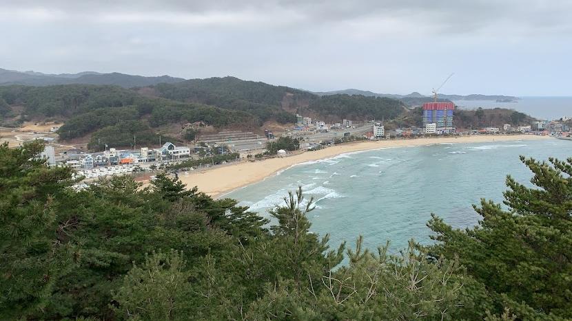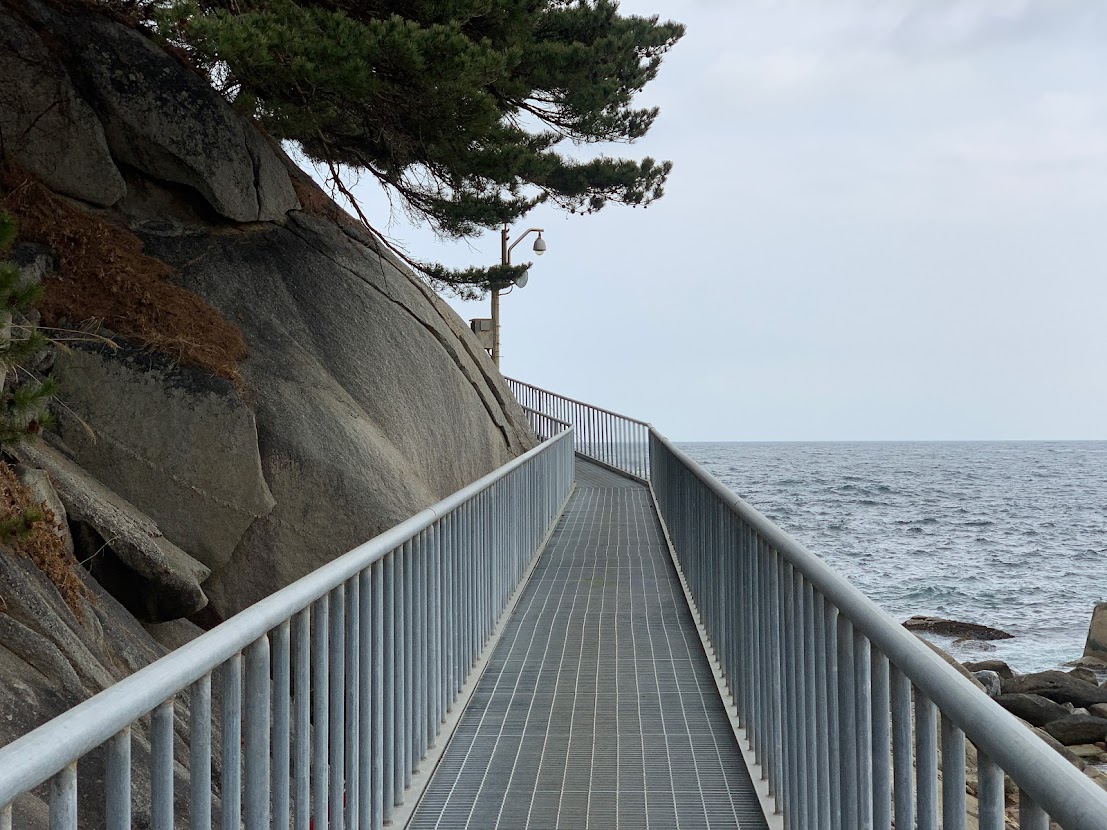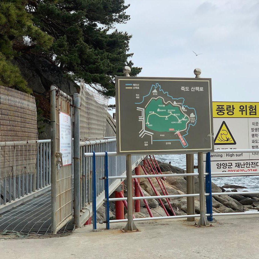 그 파란색 건물 많은 쪽으로 쭈욱 직진하면 죽도 산책로 입구가 보여요.