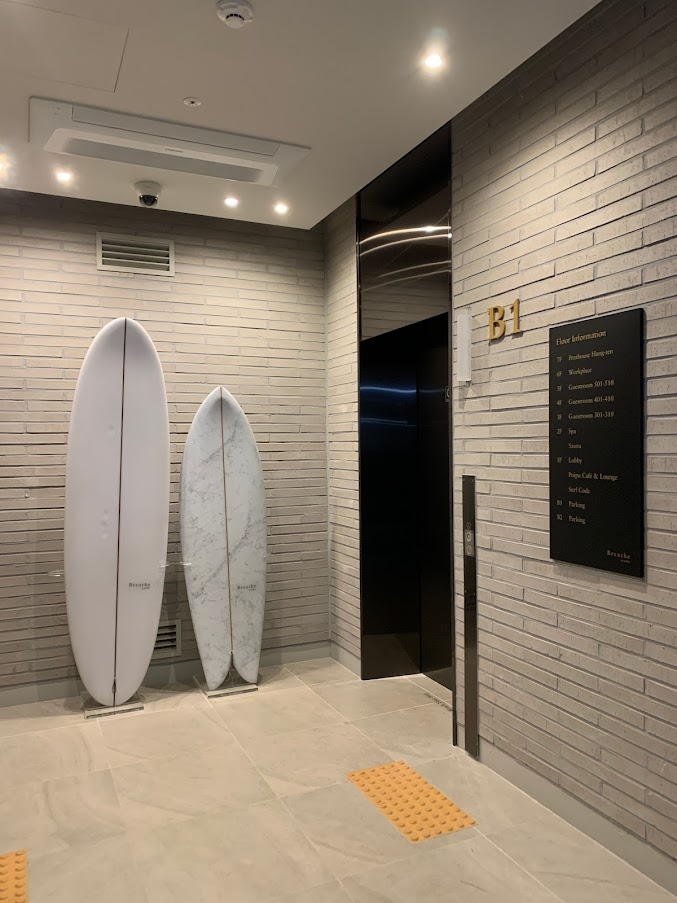 지하에 주차하고 엘리베이터를 타려고 보니 서프보드가 있었고, 1층에는 서프보드 스토리지도 마련되어 있습니다.
