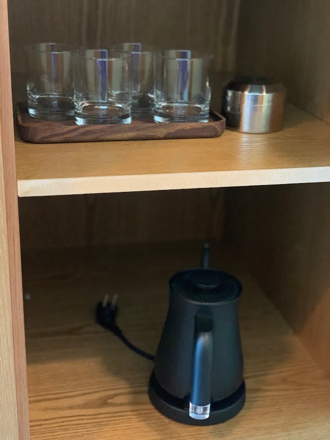 따로 조리할 수 있는 것은 없고, 차를 마실 수 있는 전기 포트와 티백 4개가 있습니다.