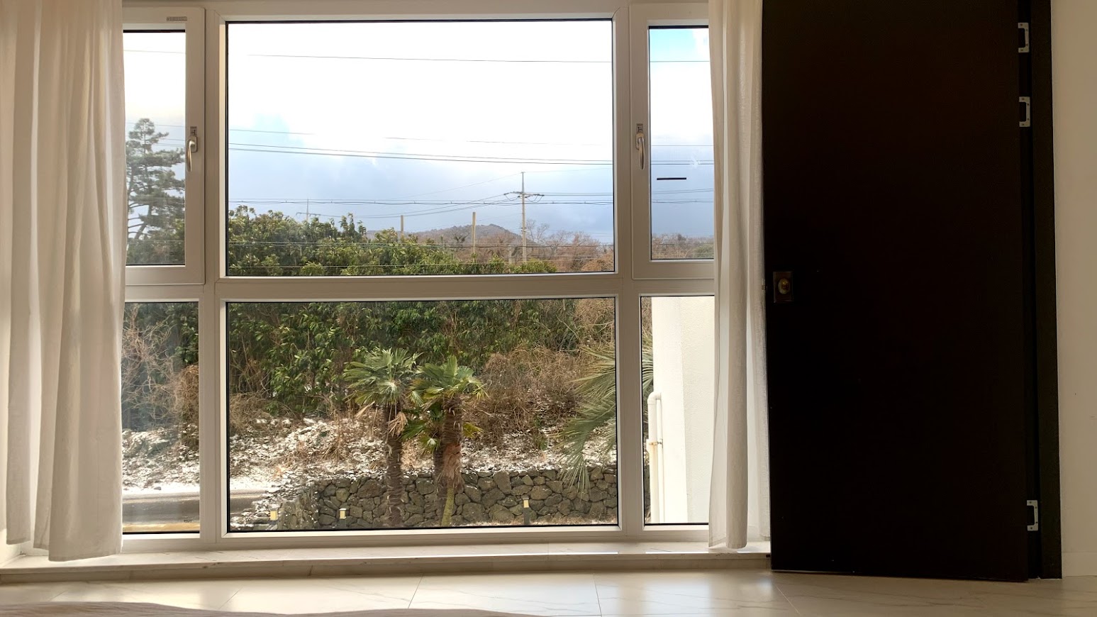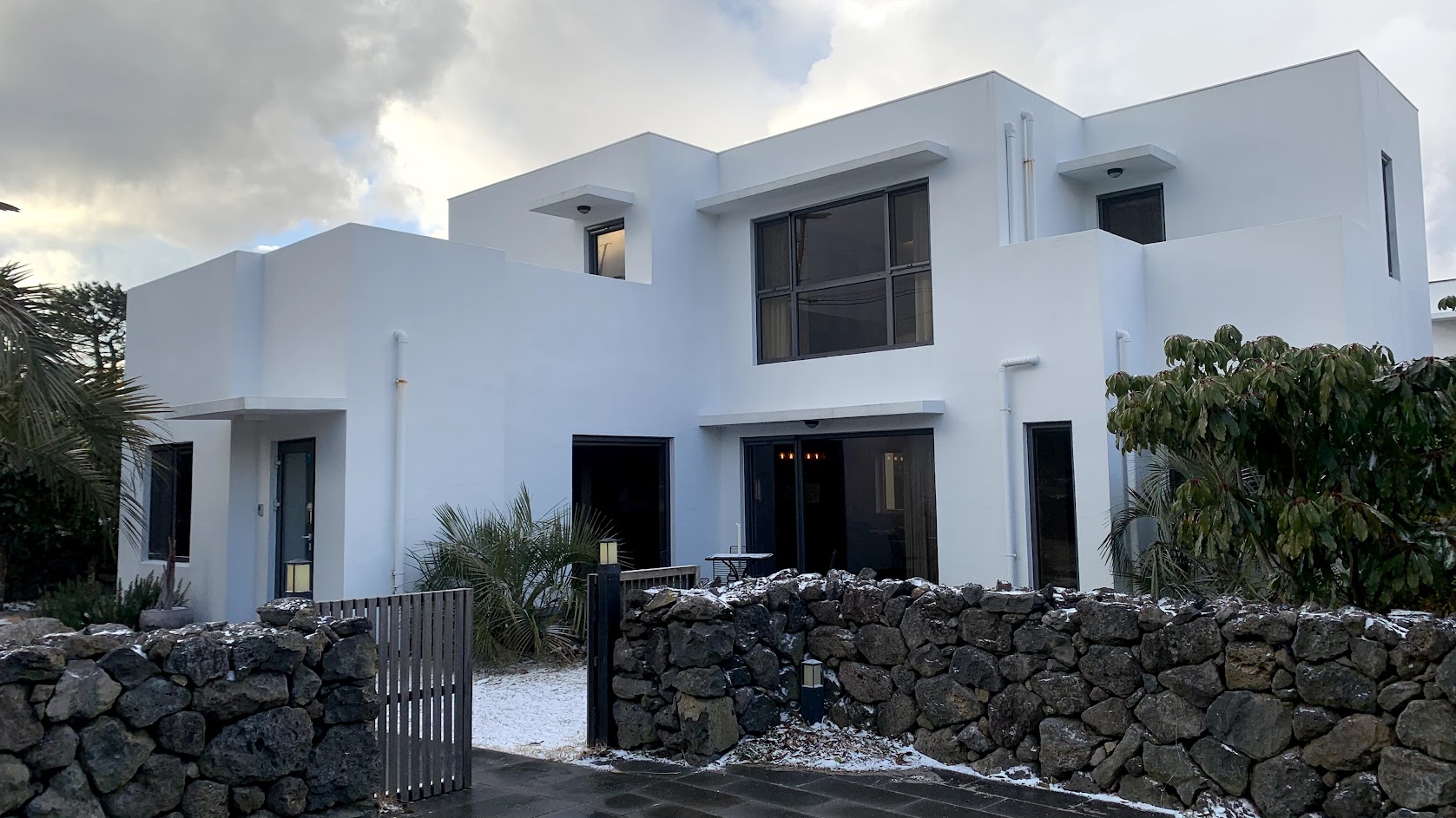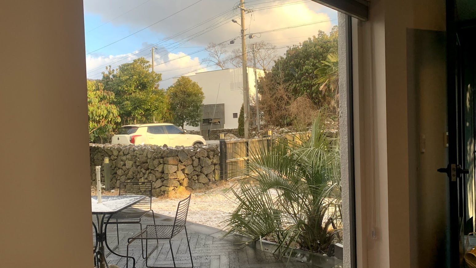 눈이 쌓인 제주도 숙소 풍경