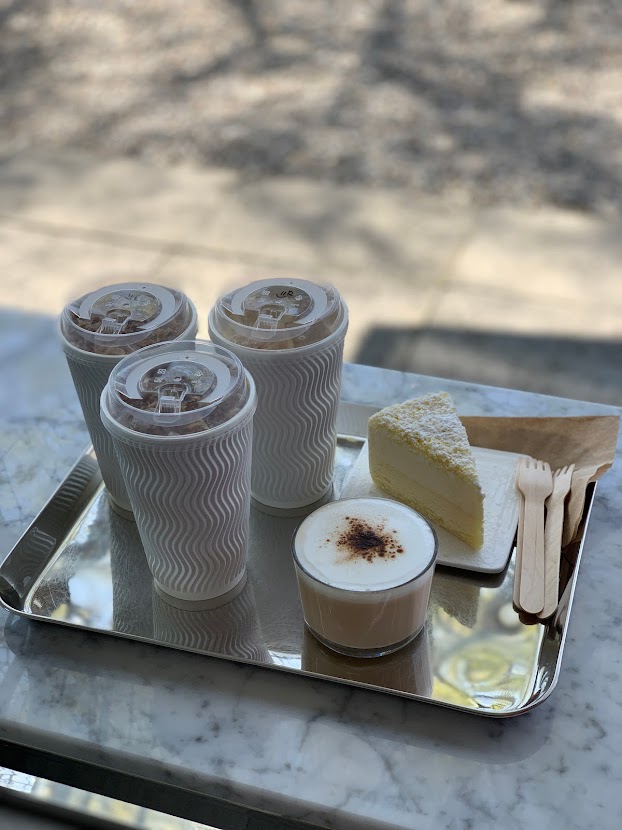 우린 따뜻한 아메리카노, 아이스라떼, 바닐라 알리에르, 치즈 케이크, 퍼푸치노 이렇게 시켰습니다.