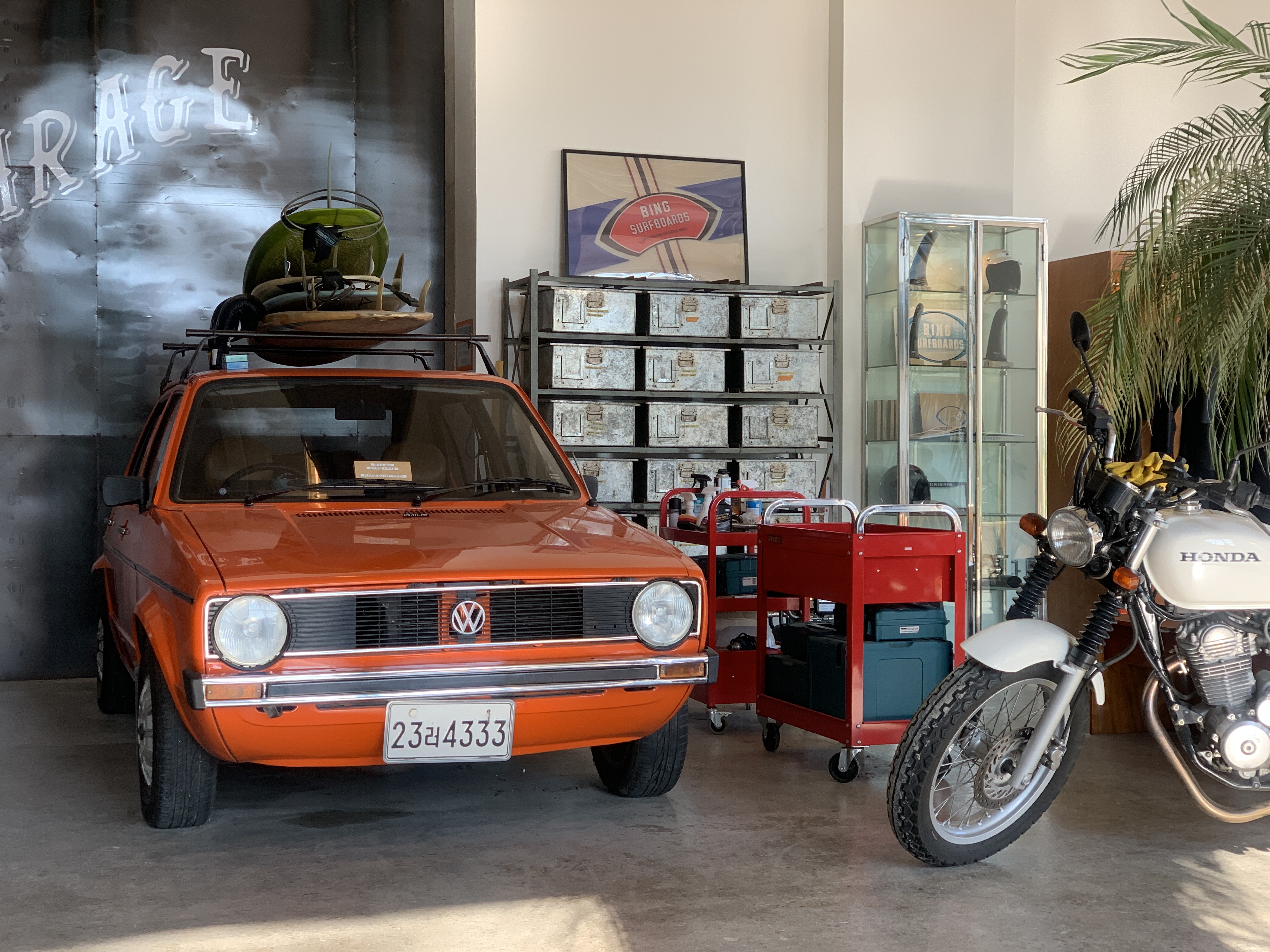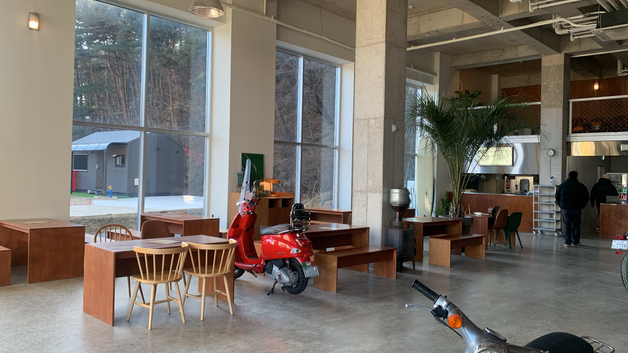 - 탁 트인 층고와, 식물 + 원색의 차와 오토바이로 분위기가 좋았어요.