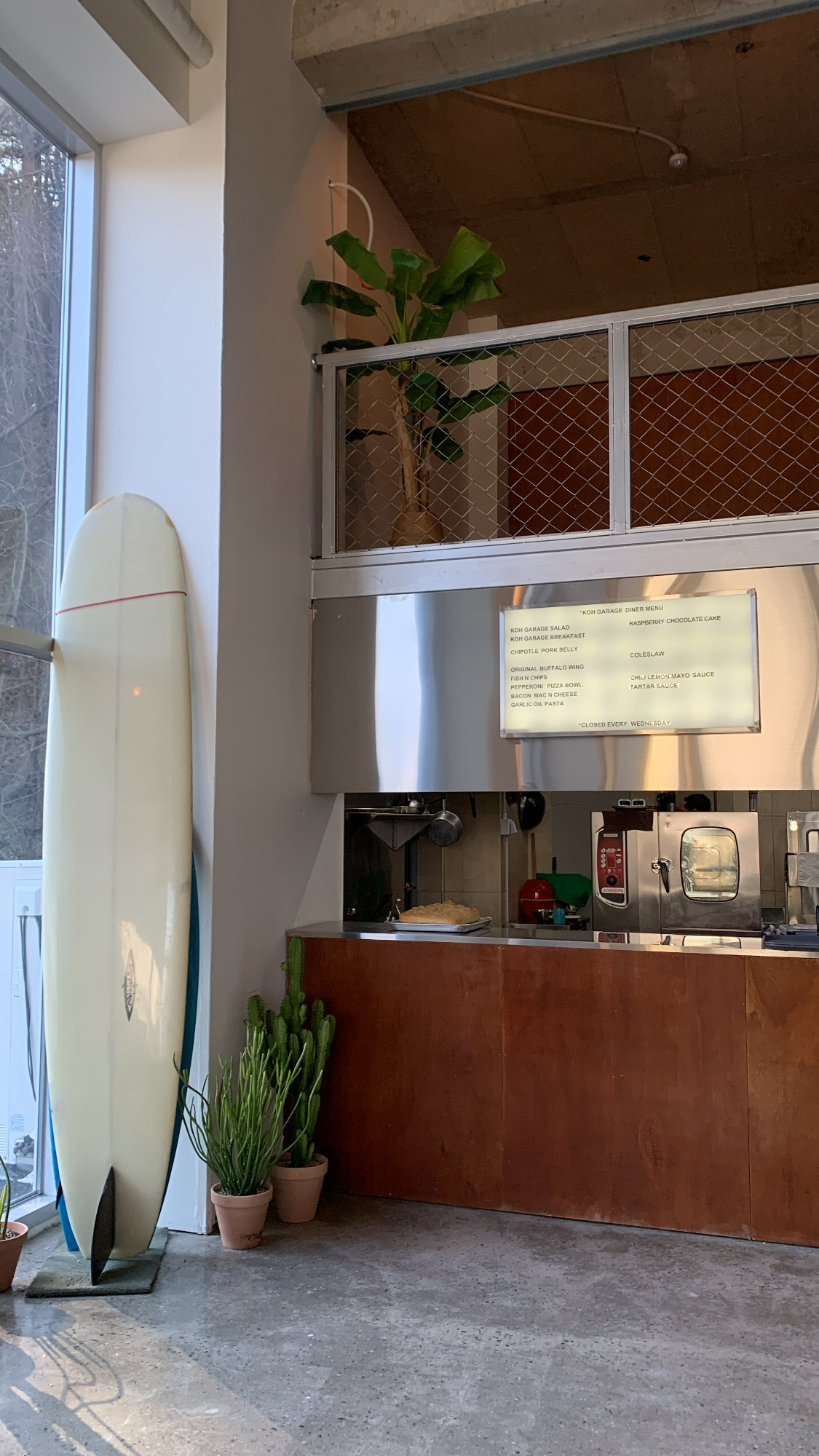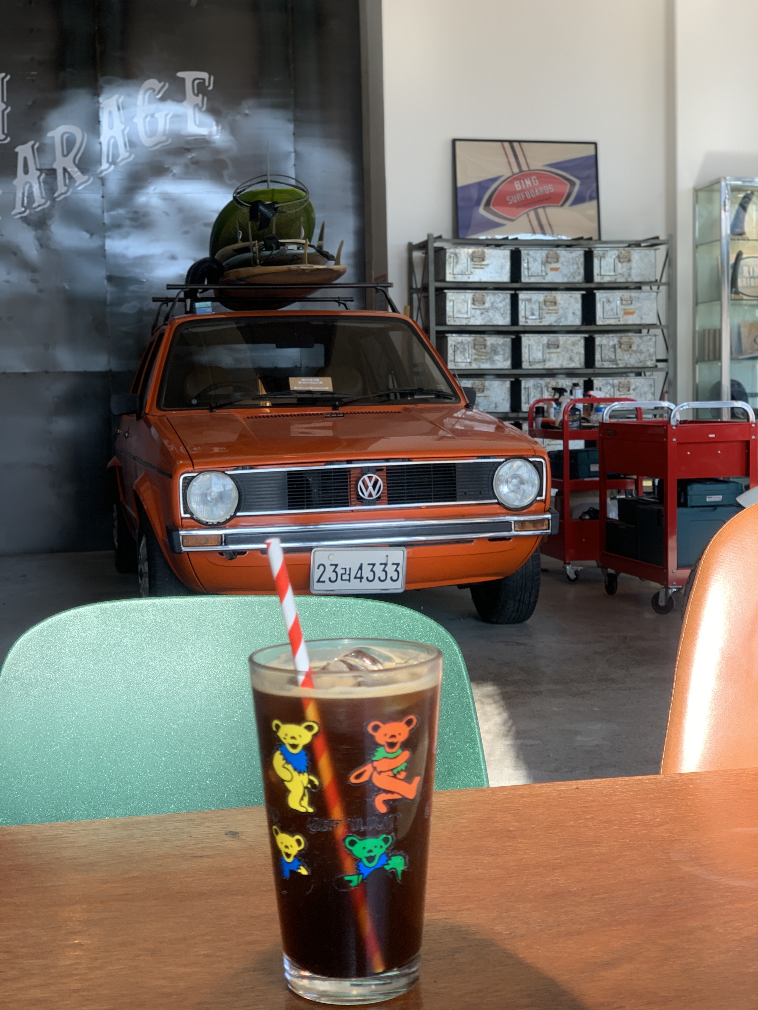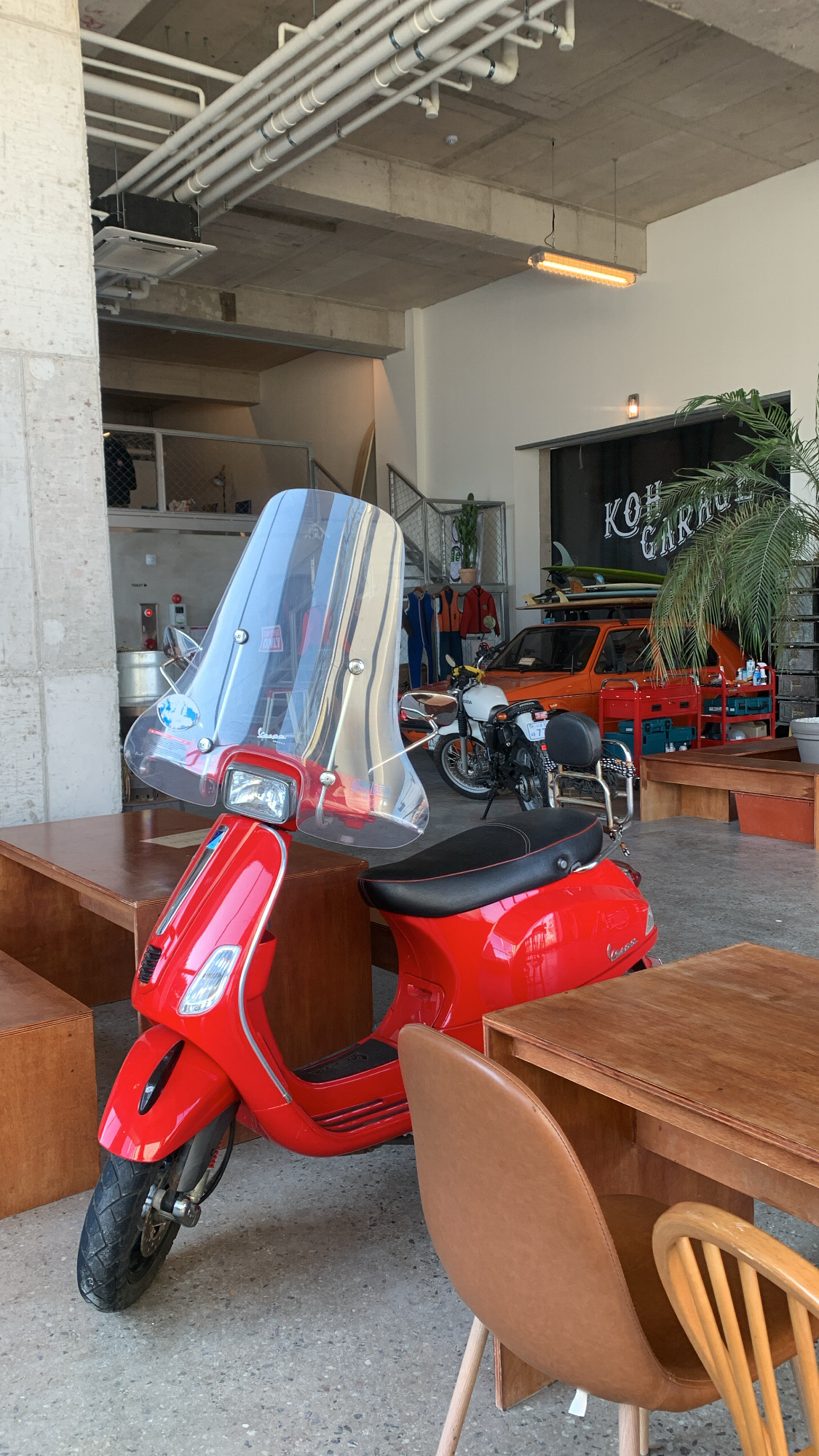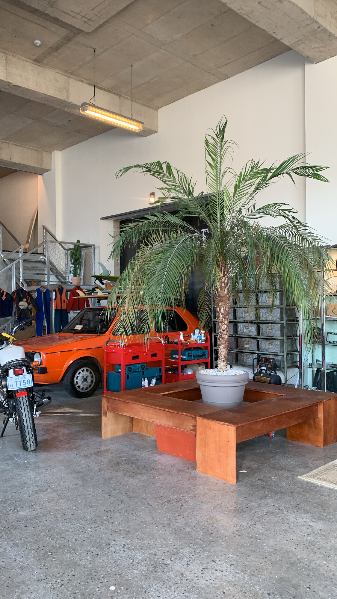- 탁 트인 층고와, 식물 + 원색의 차와 오토바이로 분위기가 좋았어요.