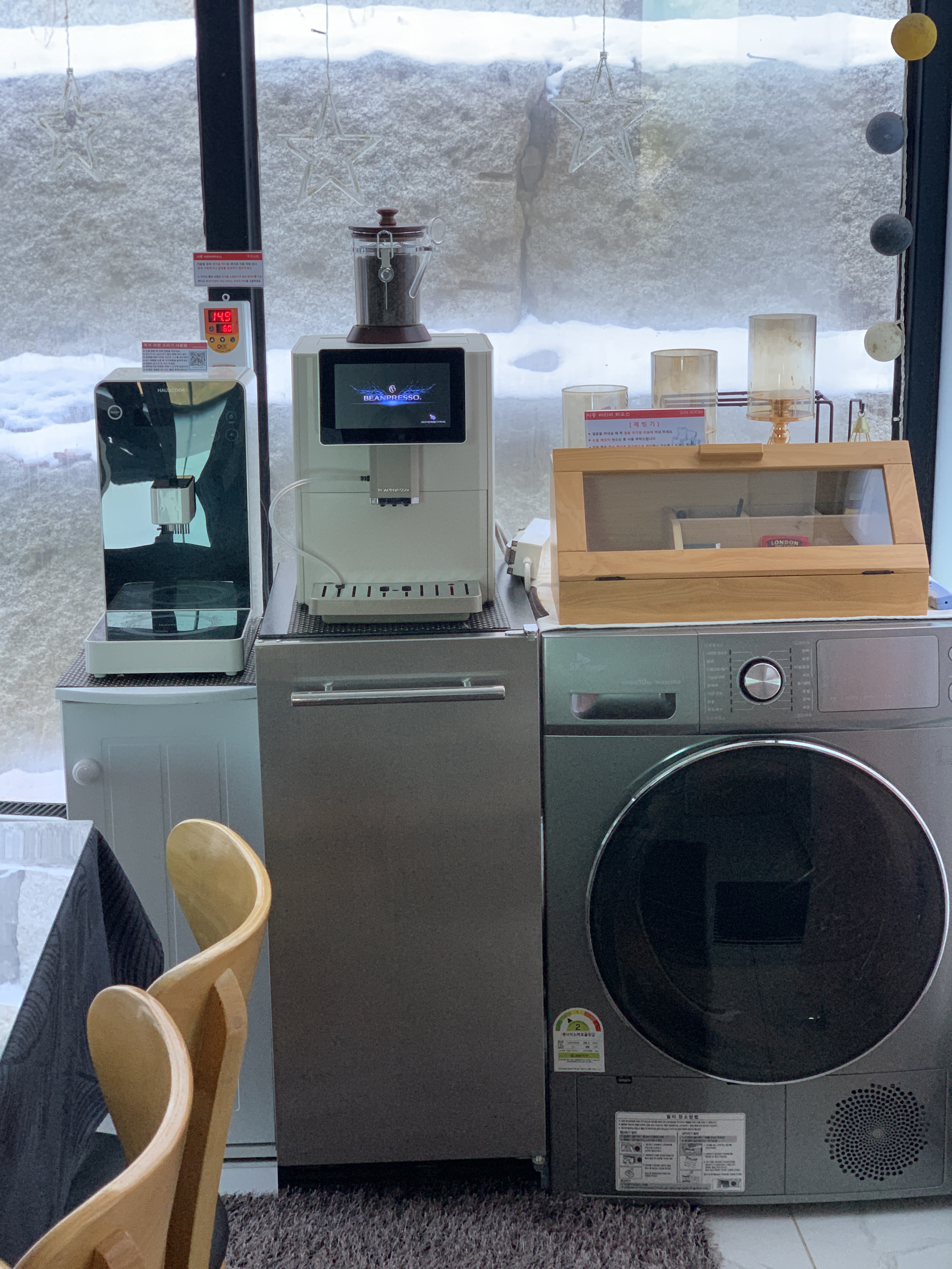 제빙기, 라면 조리기, 테이블, 의자