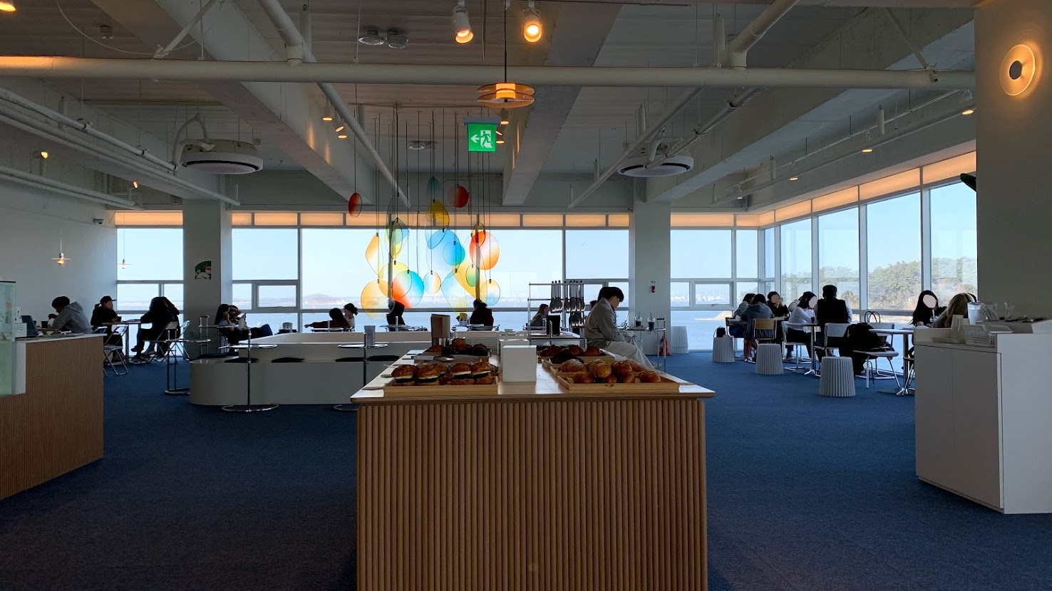 파란색 톤의 분위기에 통창이 3면으로 있어서 어떤 자리에 앉던