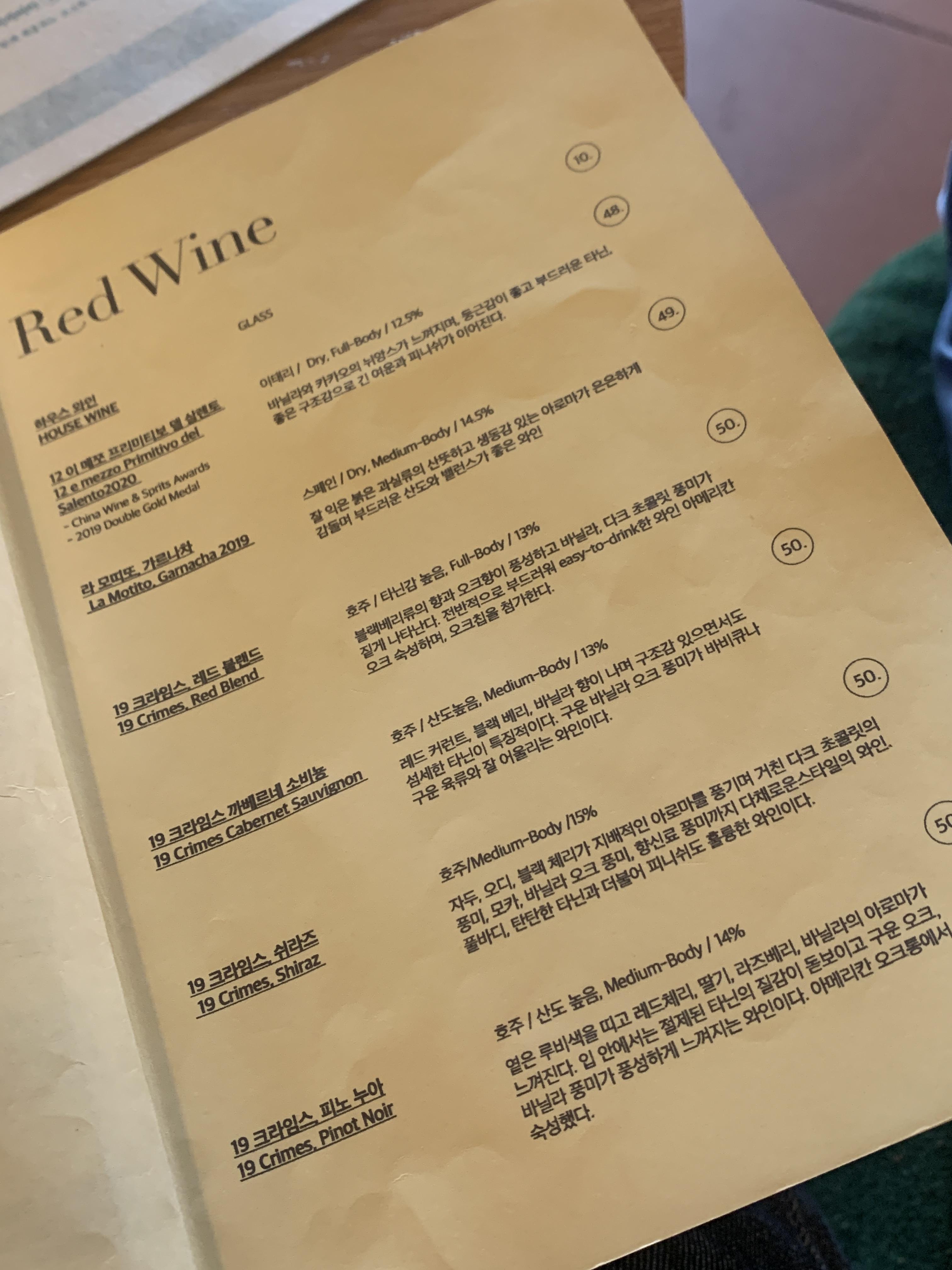 와인 가격은 5만 원 대의 와인들도 있어서 좋았어요.