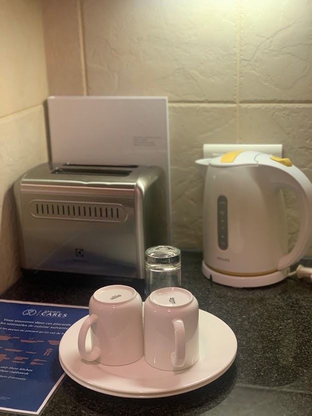 커피 포트와 토스터기 그리고 전자레인지가 주방에 있습니다.