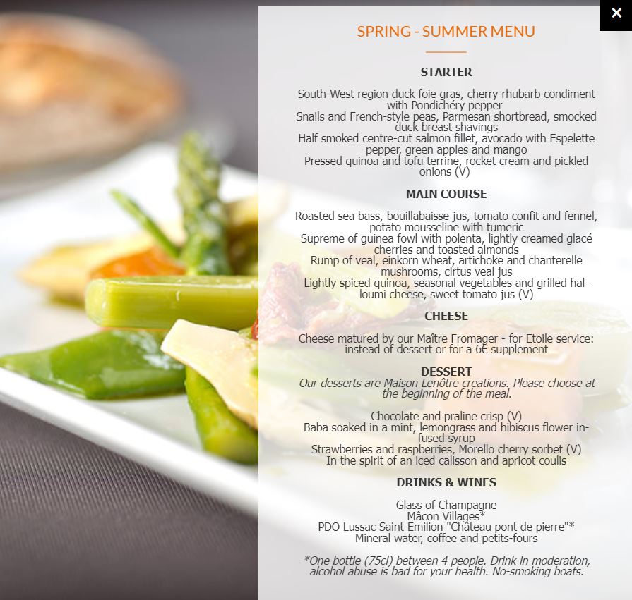 식사는 스타터, 메인 디쉬, 치즈, 디저트, 커피 순서로 먹을 수 있습니다.