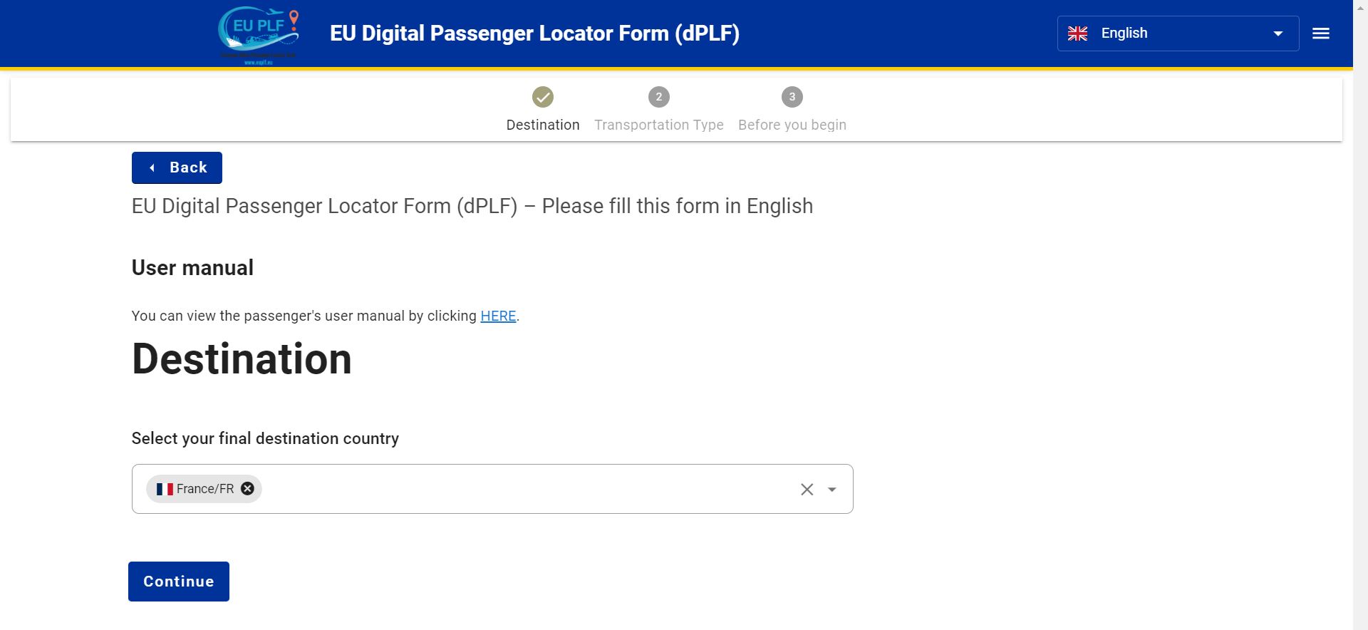 1. 도착지(Destination)에 입국할 국가 선택하고 continue 클릭!