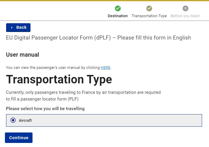 2. 이동 방법(Transportation Type)은 비행기(Aircraft) 선택 후 continue.